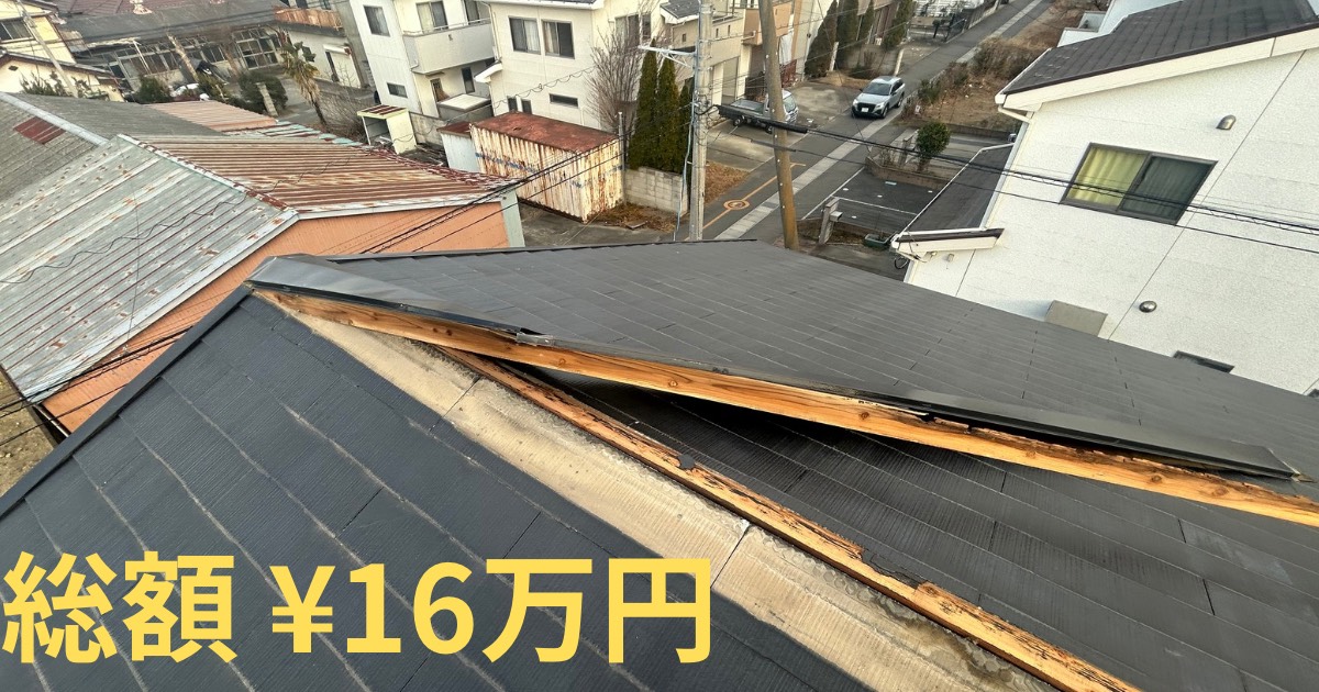 棟板金は屋根の一番高い位置にあり、一度外れると風にあおられて遠くまで飛ぶ危険性があります。